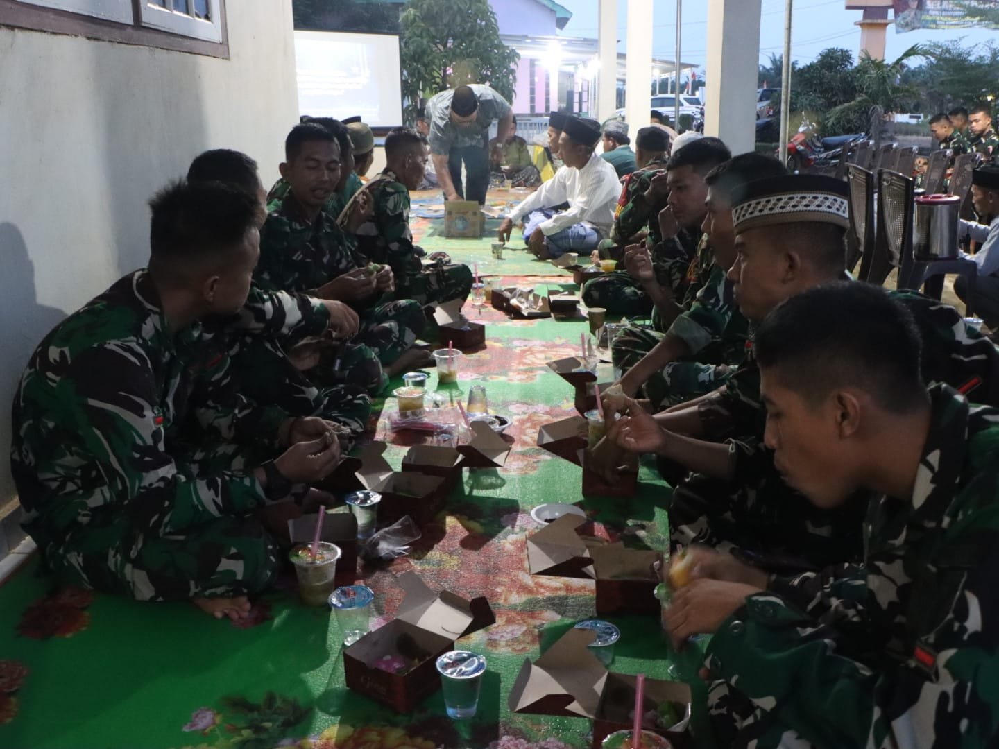 Acara buka puasa bersama berlangsung dengan penuh keakraban. Warga dan anggota Satgas TMMD terlihat menikmati kebersamaan sambil berbincang santai menunggu waktu berbuka.