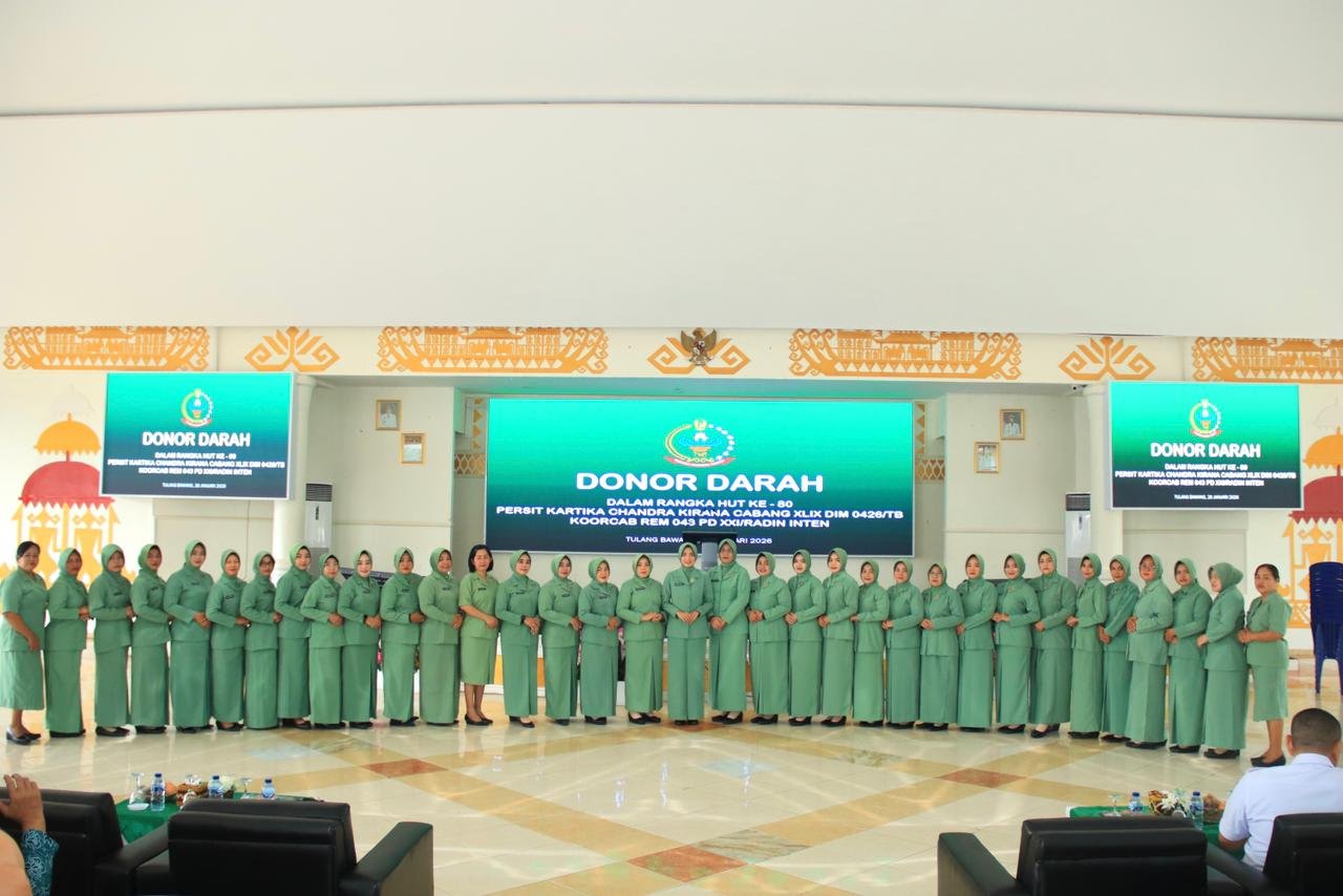 Menggala (Tulang Bawang) — Dalam rangka memperingati Hari Ulang Tahun (HUT) ke-80 Persit Kartika Chandra Kirana (KCK), Kodim 0426/Tulang Bawang menggelar kegiatan donor darah massal yang berlangsung di Gedung Serba Guna (GSG), Jalan Cendana, Kelurahan Menggala Selatan, Kecamatan Menggala, Kabupaten Tulang Bawang, Rabu (28/1/2026).
