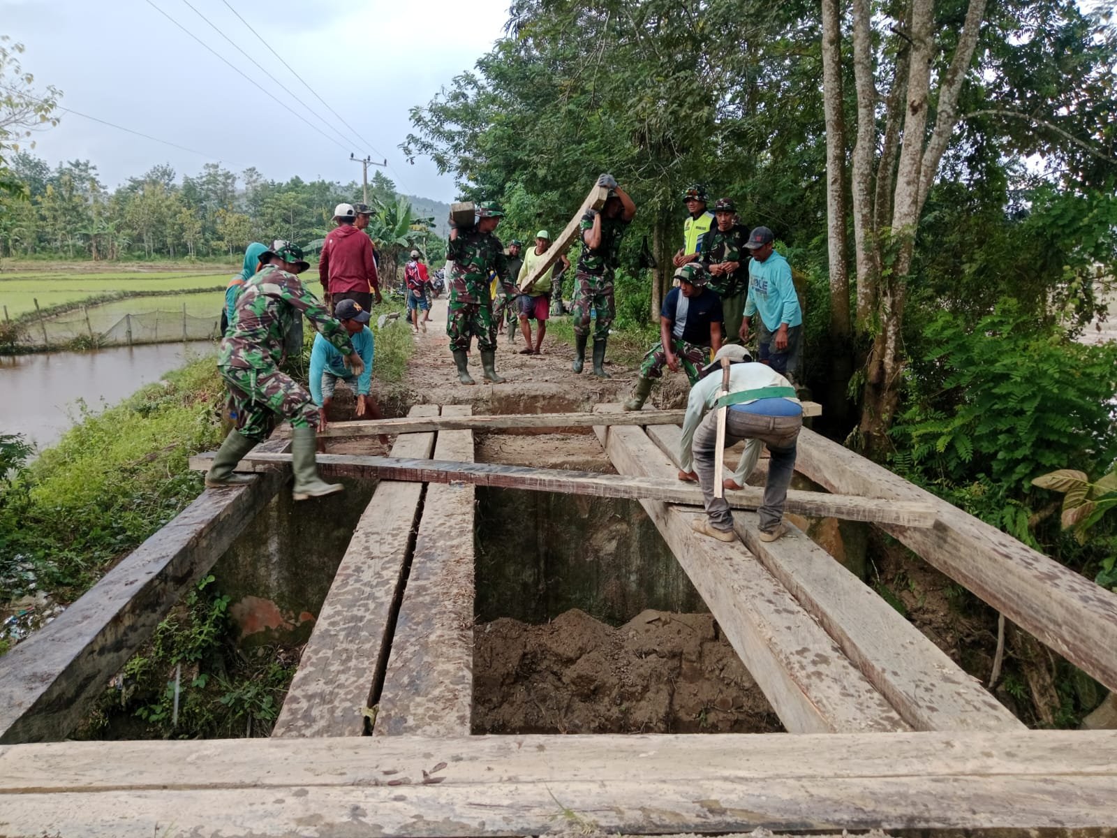 Meski menghadapi cuaca tak bersahabat dan arus sungai yang cukup deras, para prajurit tetap bekerja dengan penuh dedikasi. Mereka secara bergantian mengemudikan perahu demi menjaga keamanan dan kelancaran pengiriman material. Warga setempat juga turut ambil bagian, menciptakan suasana gotong royong dan memperkuat kemanunggalan TNI dan rakyat.