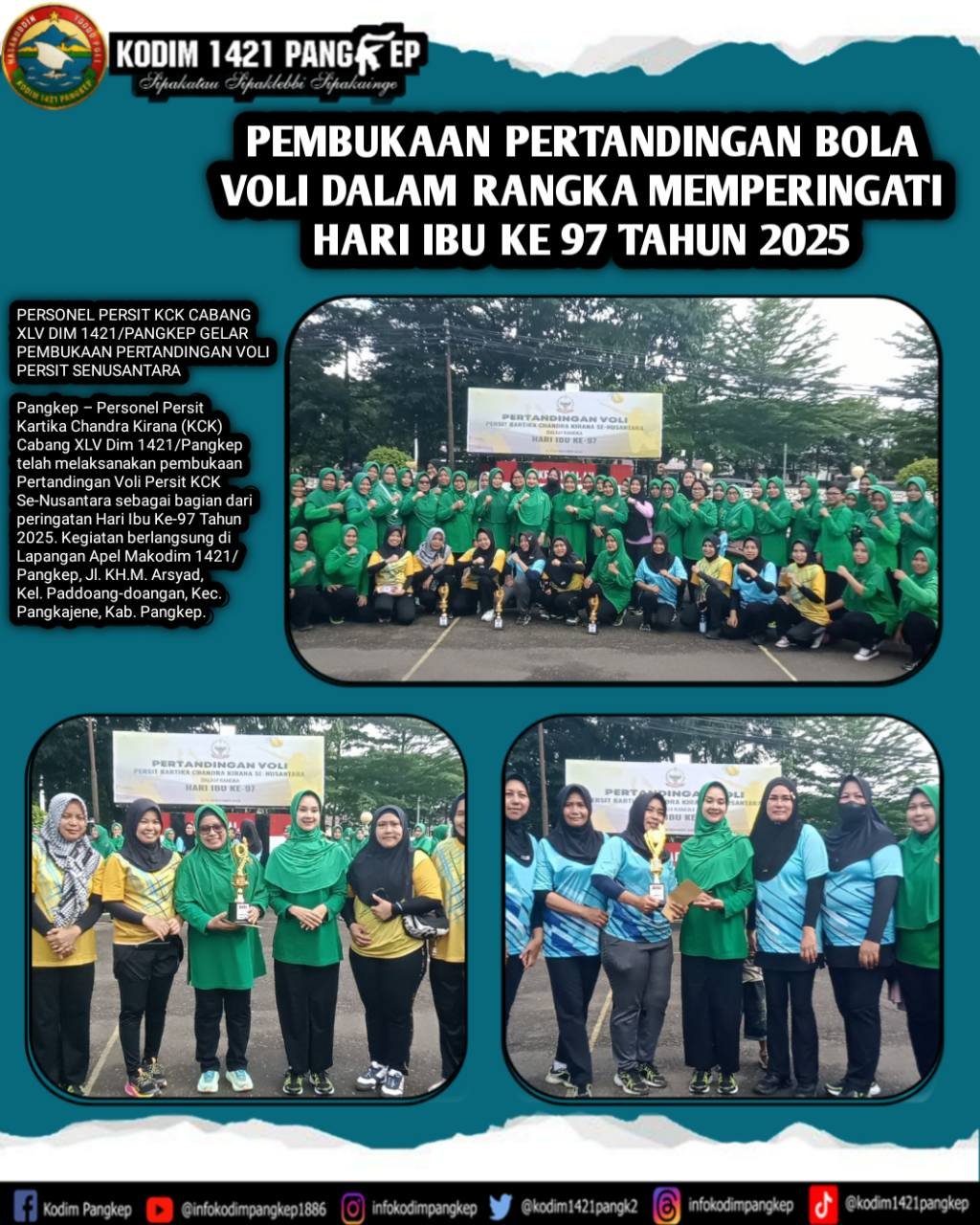 Pangkep – Persit Kartika Chandra Kirana (KCK) Cabang XLV Dim 1421/Pangkep menggelar pembukaan Pertandingan Voli Persit KCK Se-Nusantara dalam rangka memperingati Hari Ibu ke-97 Tahun 2025. Kegiatan tersebut dilaksanakan di Lapangan Apel Makodim 1421/Pangkep, Jalan KH. M. Arsyad, Kelurahan Paddoang-doangan, Kecamatan Pangkajene, Kabupaten Pangkep.