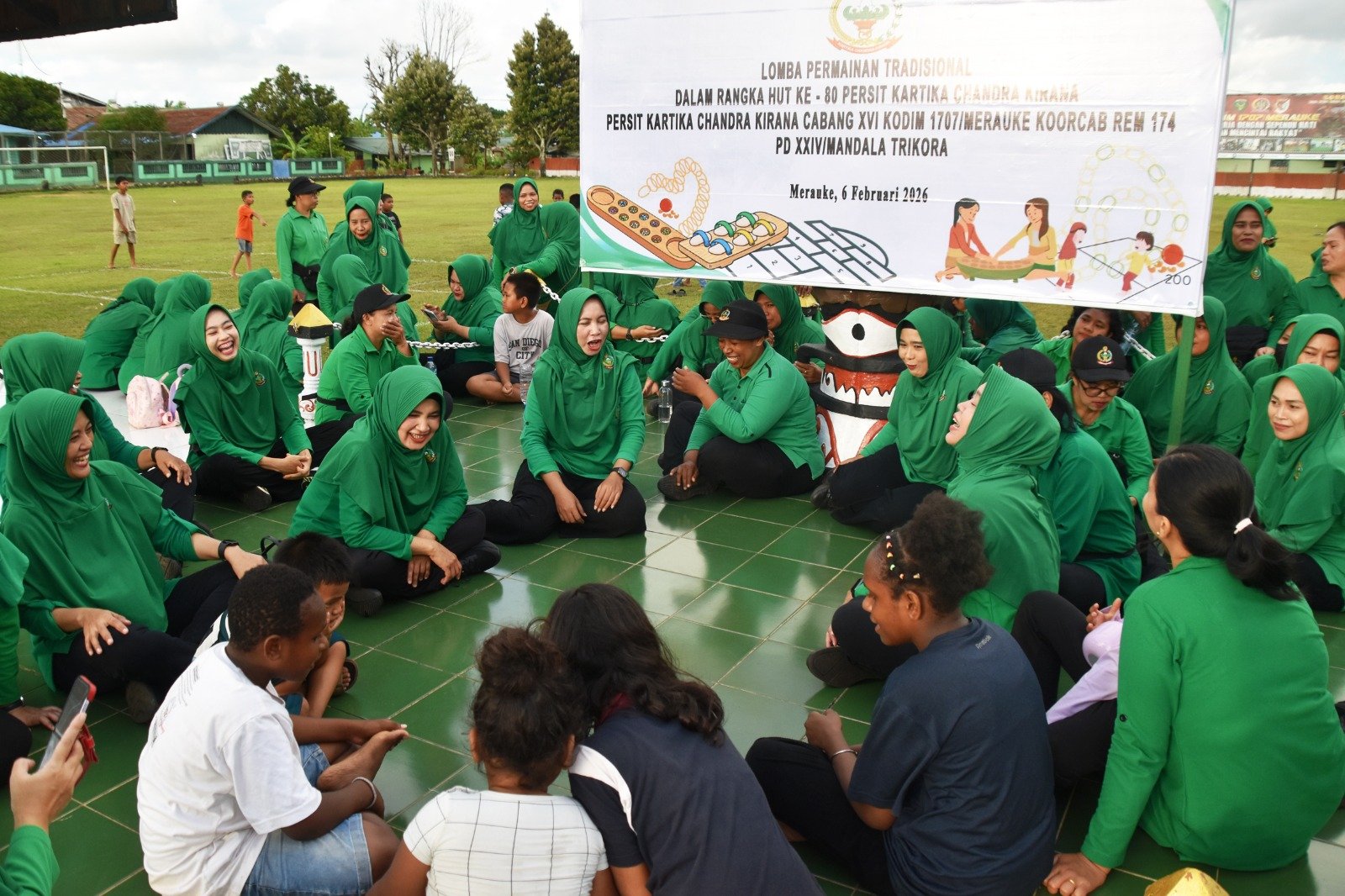MERAUKE – Dalam rangka memperingati Hari Ulang Tahun (HUT) Ke-80 Persit Kartika Chandra Kirana Tahun 2026, Persit Kartika Chandra Kirana Cabang XVI Kodim 1707/Merauke menggelar kegiatan perlombaan yang berlangsung meriah di Lapangan Makodim 1707/Merauke, Jln. Raya Mandala, Kabupaten Merauke – Provinsi Papua Selatan, Jumat sore (6/2/2026).