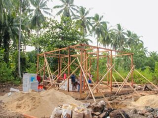 Seorang personel tampak cekatan mengarahkan proses pembengkokan besi tulangan sesuai spesifikasi konstruksi yang telah ditentukan. Dengan memanfaatkan alat manual sederhana di atas meja kerja kayu darurat, ketelitian tetap menjadi prioritas utama.