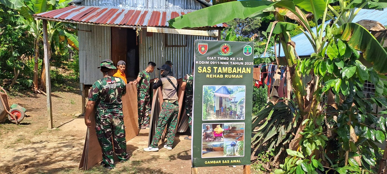 Dalam proses pengerjaan, personel Satgas TMMD menggunakan berbagai peralatan pertukangan seperti gergaji dan Senso untuk membelah dan memotong kayu agar terbentuk papan sesuai kebutuhan. Warga setempat juga turut serta dalam pekerjaan ini, menunjukkan semangat gotong royong yang kuat antara TNI dan masyarakat.