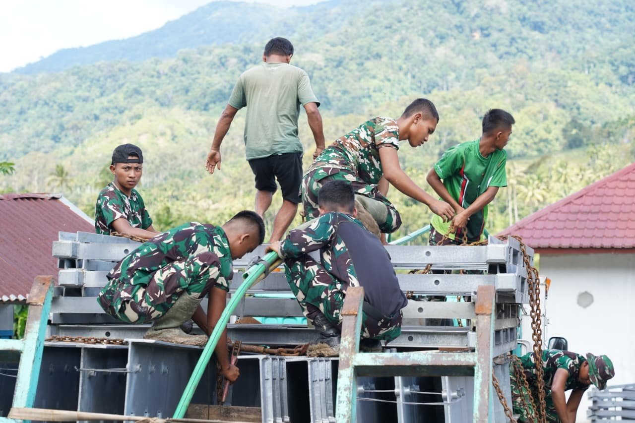 Nagan Raya — Personel TNI bersama warga dan dinas terkait melaksanakan penurunan bahan konstruksi Jembatan Bailey yang akan segera dibangun di wilayah Kecamatan Beutong Ateuh Benggalang, Kabupaten Nagan Raya, Minggu (20/12/2025).