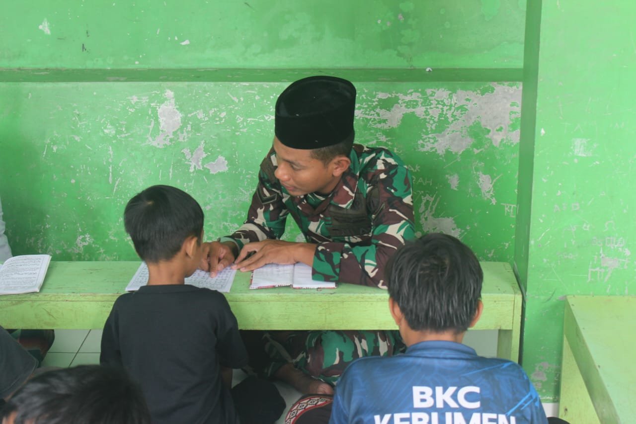 Dengan penuh kesabaran, Serda Khairul M membimbing para santri membaca huruf-huruf hijaiyah. Duduk bersila bersama anak-anak, ia mengarahkan pelafalan dengan telaten, menciptakan suasana belajar yang hangat dan penuh keakraban. Kehadiran prajurit TNI di tengah-tengah santri kecil tersebut memberikan warna tersendiri, terlebih menjelang datangnya bulan suci Ramadhan.