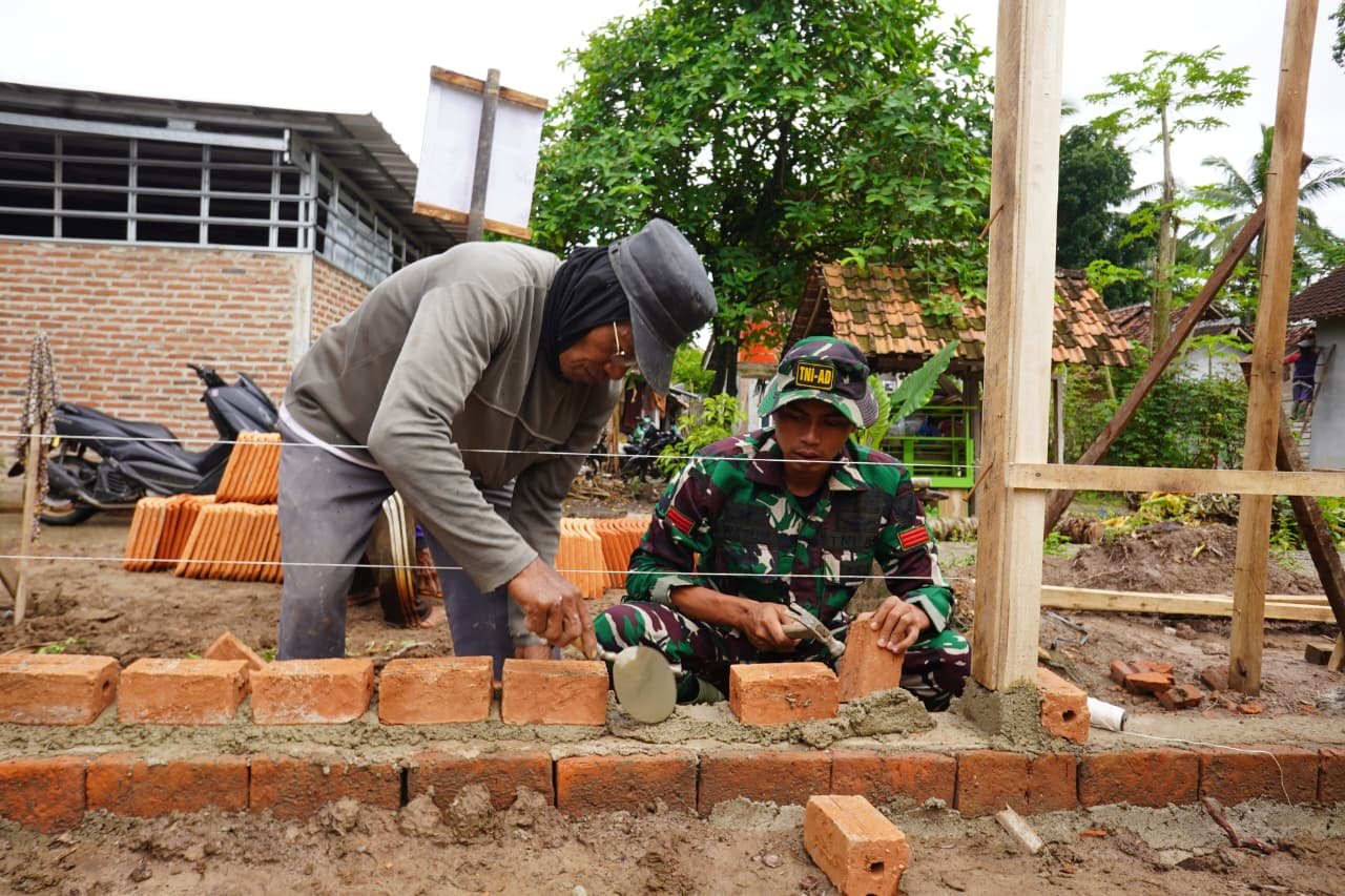Pesawaran — Personel TMMD ke-127 dari Kodim 0421/Lampung Selatan, Praka Watum, tampak penuh semangat membantu pemasangan batu bata pada rehabilitasi Rumah Tidak Layak Huni (RTLH) milik Bapak Khoirul Anwar di Desa Tanjung Rejo, Kecamatan Way Khilau, Kabupaten Pesawaran.