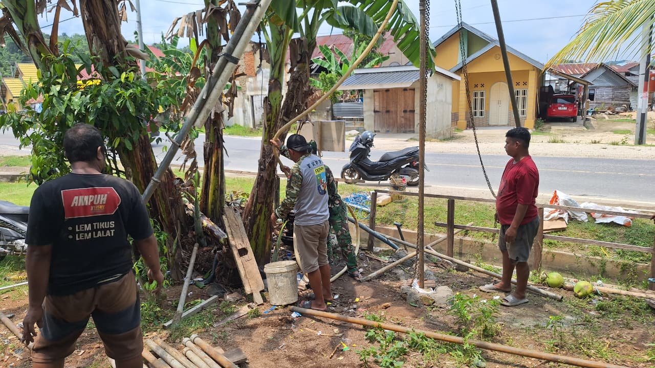 Personel Satgas bersama masyarakat terlihat kompak melakukan pencarian dan penggalian titik sumber air guna memastikan ketersediaan sanitasi yang layak bagi warga setempat.