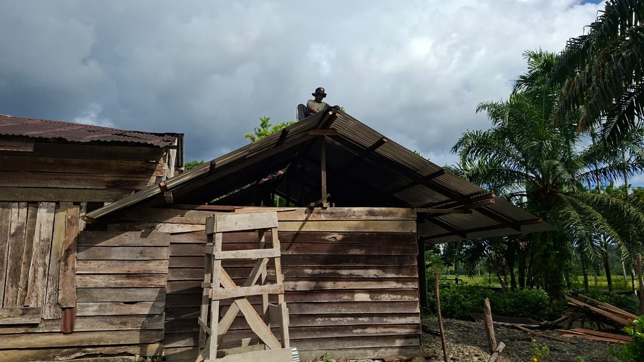 Selanjutnya, material baru dipasang untuk menggantikan bagian rumah yang telah dibongkar. Pemasangan atap seng baru dilakukan secara sistematis agar bangunan lebih kokoh dan mampu memberikan perlindungan maksimal dari cuaca.