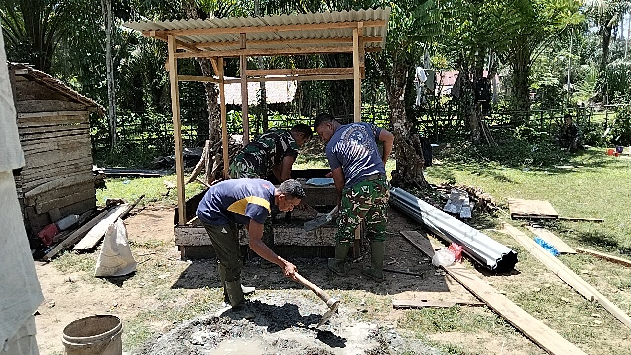 Pada Senin (9/3/2026), personel Satgas TMMD bersama warga mulai membangun jamban bagi keluarga kurang mampu yang belum memiliki fasilitas sanitasi layak.
