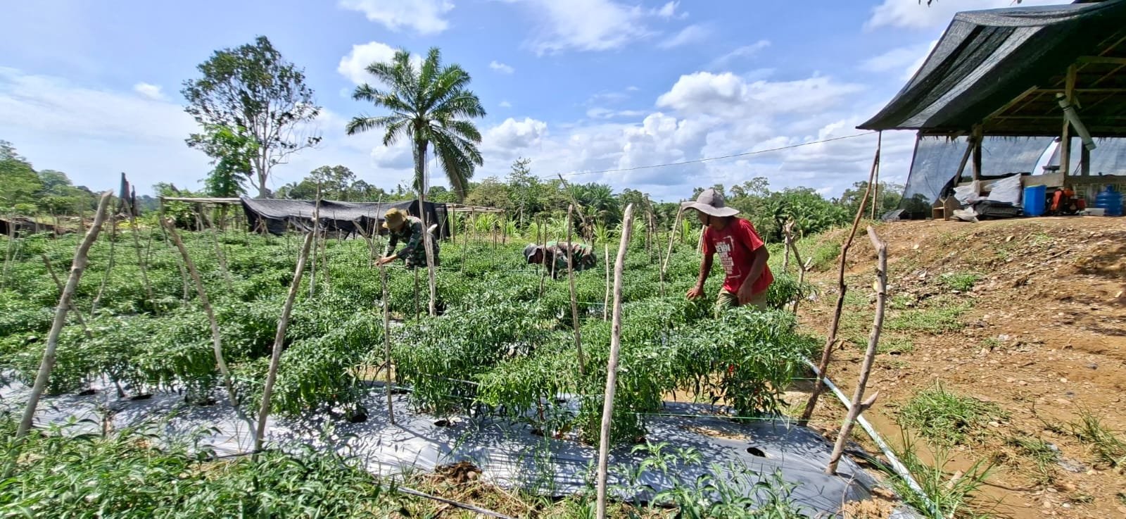 Selasa (10/3/2026), personel Satgas bersama warga kembali melakukan perawatan tanaman dengan menyiangi gulma serta melakukan pengendalian hama agar tanaman dapat tumbuh optimal.