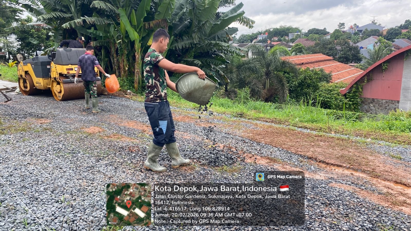 Depok – Satgas TNI Manunggal Membangun Desa (TMMD) Ke-127 Tahun Anggaran 2026 dari Kodim 0508/Depok terus mempercepat pengerjaan sasaran fisik berupa pengerasan jalan di kawasan GDC Sektor Gardenia Blok Q RT 03/07, Kelurahan Tirtajaya, Kecamatan Sukmajaya, Kota Depok, Jumat (20/2/2026).