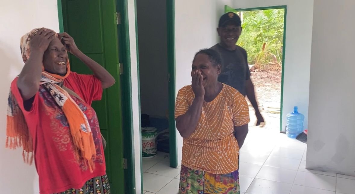 Raut wajah bahagia Ibu Evelina Surawi terlihat jelas saat menyaksikan rumah barunya yang hampir rampung. Kebahagiaan tersebut menjadi penyemangat tersendiri bagi personel Satgas dalam menuntaskan pekerjaan.