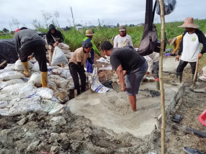 Di tengah kondisi medan yang berair dan berlumpur, semangat warga tetap tinggi. Mereka bahu-membahu mengerjakan setiap tahapan pembangunan dengan penuh ketelitian, khususnya pada pemasangan tulang besi dan proses pengecoran pondasi yang memerlukan presisi tinggi.