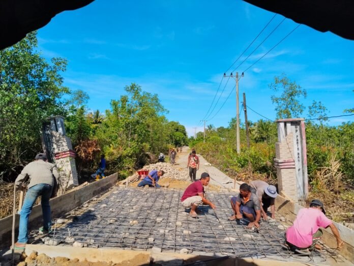 Pemasangan rangka pengecoran ini merupakan tahapan krusial guna memastikan kekuatan dan ketahanan jembatan saat difungsikan nantinya. Meski di bawah terik matahari, proses pekerjaan tetap berlangsung dengan penuh semangat dan kebersamaan.