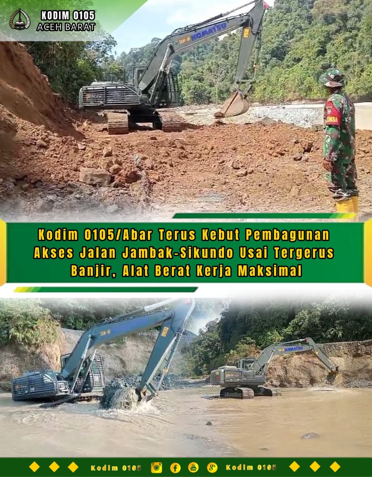 Pengerahan personel dan penerjunan alat berat ini merupakan respons cepat Dandim 0105/Abar Letkol Inf S. Kembaren, S.E., M.I.P., CFrA., sebagai upaya tindakan tanggap darurat bencana alam yang tidak hanya mengganggu aktivitas sosial masyarakat, namun juga menghambat perputaran roda perekonomian dan mobilitas sektor pertanian.