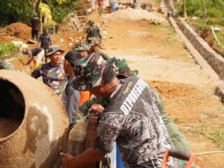 Keringat bercucuran, membasahi seragam loreng milik prajurit Tentara Nasional Indonesia. Tangan-tangan kokoh meratakan permukaan beton dengan roskam panjang. Setiap tarikan alat perata seperti menghapus kesulitan lama yang selama ini membelenggu mobilitas warga.