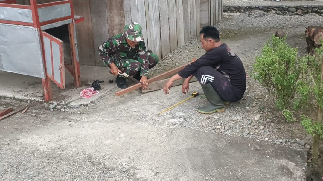 MANOKWARI – Guna meringankan kesulitan rakyat di wilayah binaannya, Babinsa Koramil 1801-03/Masni Serka Subur Muntolip Bersama Warga kampung Sibuni Melakukan rehab gerobak bakso Bapak Yono di Kampung Sibuni Distrik Masni Utara, Kabupaten Manokwari, Provinsi Papua Barat, Minggu (11/05/2025).
