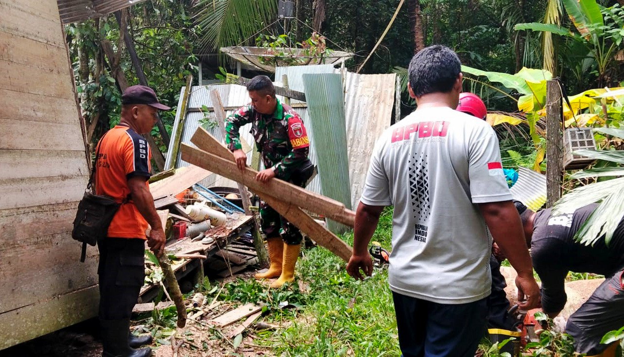 Rumah Warga HSS Rusak Berat Dihantam Pohon Tumbang, Babinsa Bersinergi Dengan BPBD Lakukan Evakuasi