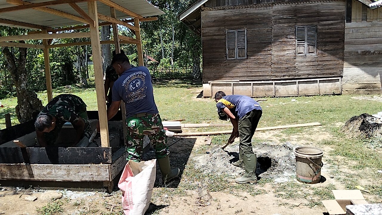 Pembangunan jamban tersebut dilakukan oleh personel Satgas TMMD bersama masyarakat secara gotong royong. Suasana kerja terasa hangat. Cangkul, sekop, dan ember semen berpindah tangan, seperti aliran semangat yang tidak putus.