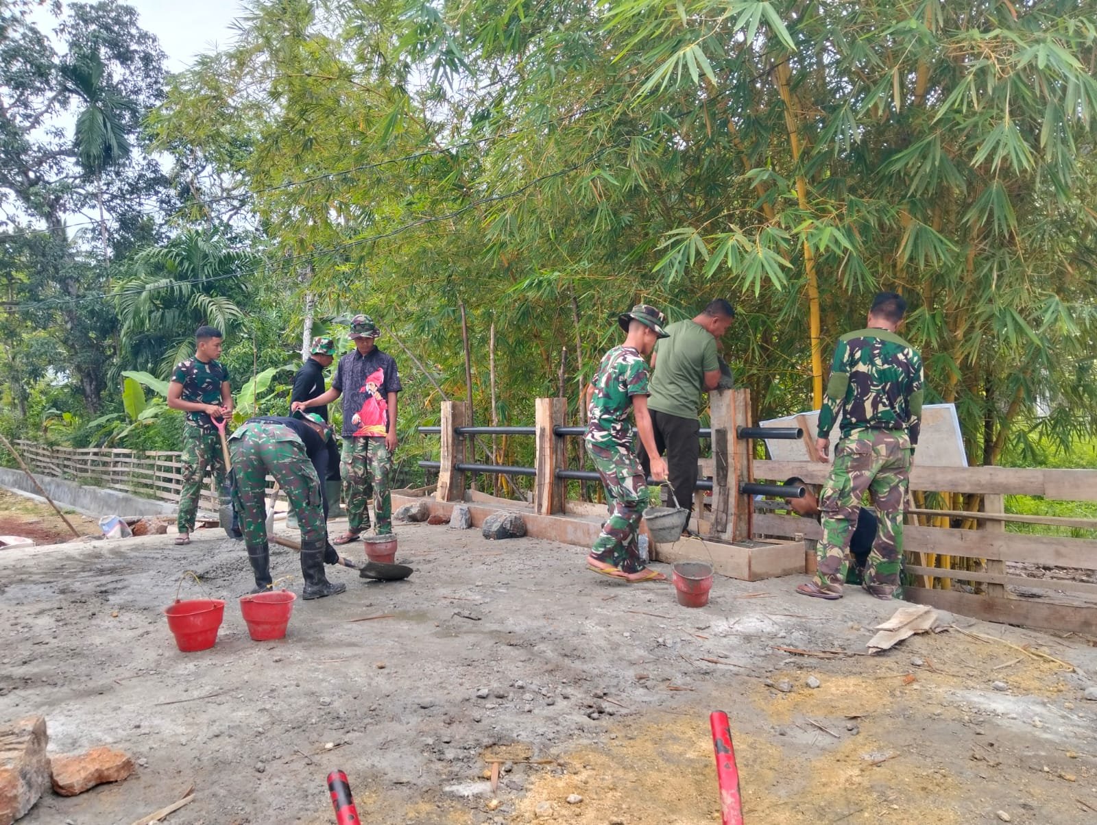 Sejak pagi, prajurit TNI bersama warga tampak sibuk menyiapkan campuran semen dan material pendukung lainnya. Proses pengecoran dilakukan secara bertahap dan teliti untuk memastikan setiap tiang memiliki kekuatan maksimal sebagai penopang pagar pengaman.