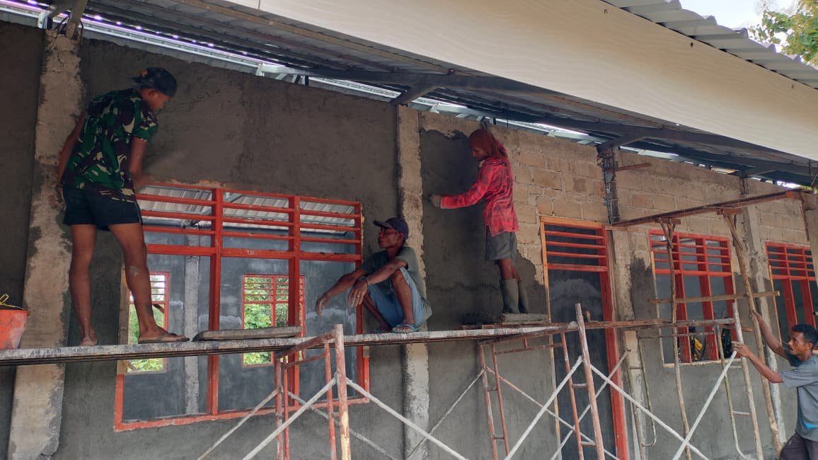 NTT–Kefamenanu – Suasana kerja penuh semangat tampak di Desa Sunkaen saat Satgas TMMD Ke-127 Kodim 1618/TTU melanjutkan pengerjaan plester dinding luar 4 RKB, Jumat (27/02/2026). Progres ini menjadi bagian penting dalam penyempurnaan struktur bangunan sekolah.