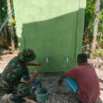 Anggota dari Kodim Kendari bersama warga setempat tampak kompak meratakan adonan semen pada susunan batu talud.