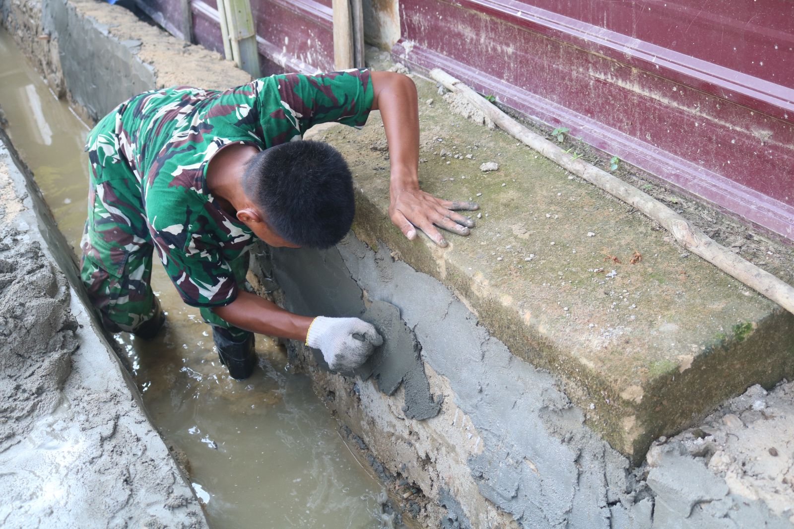Personel Satgas bersama warga tampak kompak meratakan adukan semen pada sisi-sisi drainase. Tahap ini penting untuk memperkuat konstruksi sekaligus memastikan hasil akhir terlihat rapi dan tahan lama.