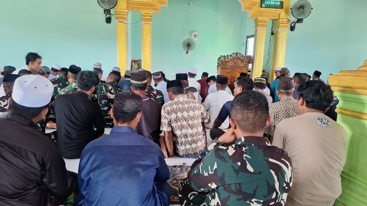 Di tengah padatnya aktivitas pembangunan fisik program TMMD, para prajurit menyempatkan diri untuk beribadah bersama masyarakat setempat. Suasana khidmat dan penuh kekhusyukan terlihat saat anggota Satgas TMMD berdiri sejajar dengan warga dalam satu saf, mencerminkan kebersamaan tanpa sekat.