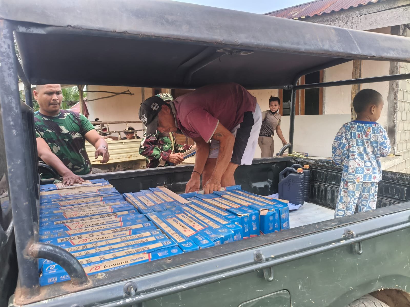 Material keramik tersebut dipindahkan secara manual menuju lokasi rumah yang sedang dibangun. Para anggota Satgas dan warga saling membantu mengangkat dan menata material agar proses pemasangan keramik dapat segera dilakukan.