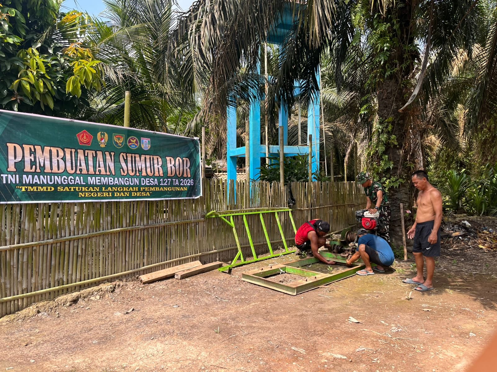 Banyuasin, 25/02/2026 – Satgas TMMD ke-127 dari Kodim 0430/BA bersama warga Desa Wonosari, Kecamatan Pulau Rimau, melanjutkan pembangunan sumur bor titik ke-2 yang berada di Jalur 1, belakang kediaman Kepala Desa.