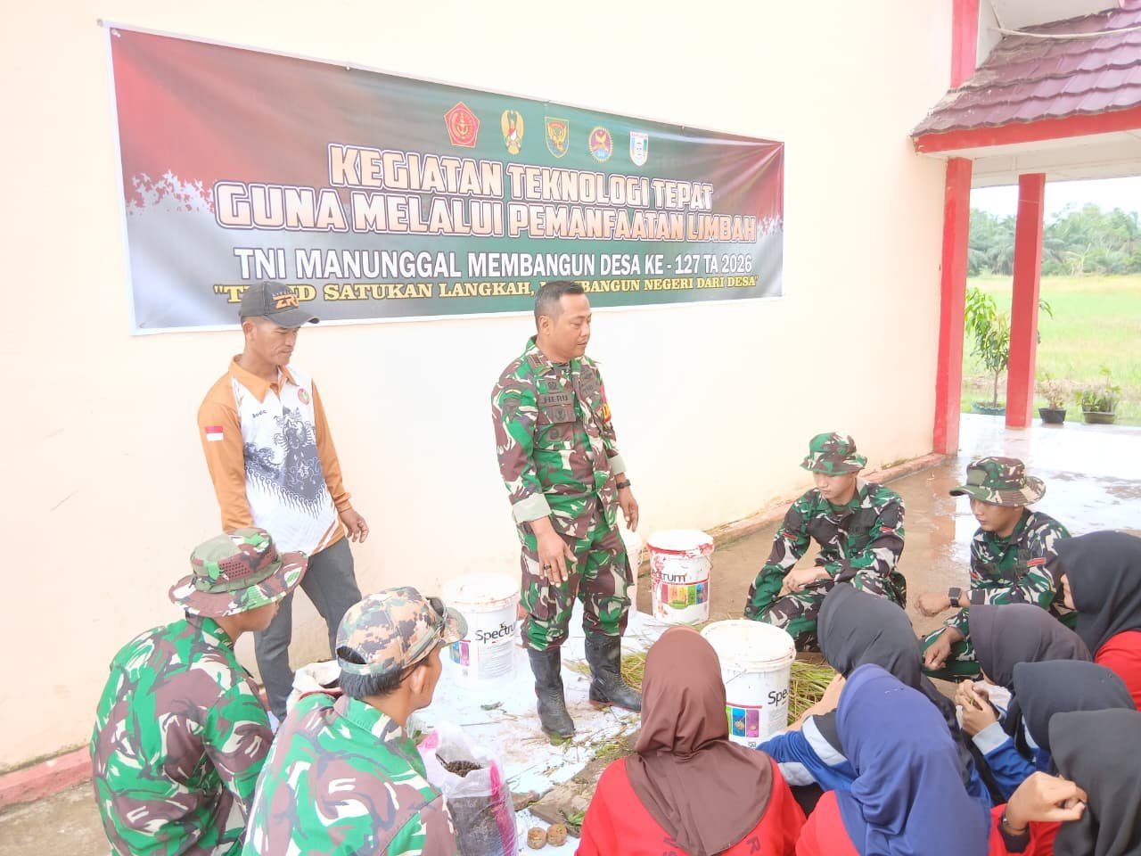 Banyuasin – Anggota Satgas TMMD ke-127 Kodim 0430/Banyuasin bersama siswa SMPN 3 Pulau Rimau Desa Wonosari melaksanakan kegiatan teknologi tepat guna dengan memanfaatkan limbah jerami padi menjadi pupuk organik.
