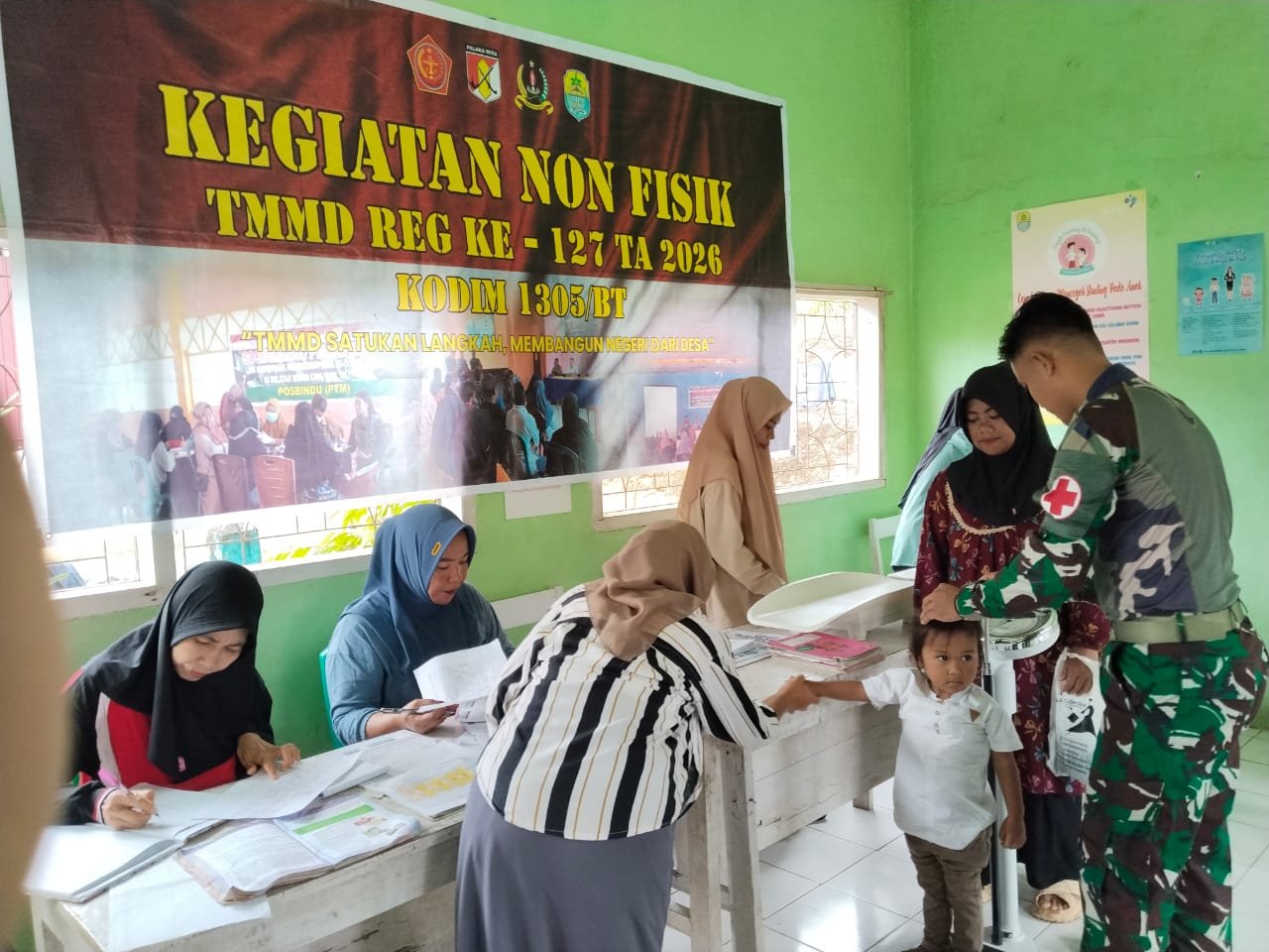 Tolitoli – Dalam rangka mendukung peningkatan kesehatan masyarakat, Satgas TMMD ke-127 dari Kodim 1305/Buol Tolitoli melaksanakan kegiatan non fisik berupa pelayanan Posyandu dan Posbindu di Desa Oyom, Kecamatan Lampasio, Kabupaten Tolitoli, Jum’at (20/2/2026).