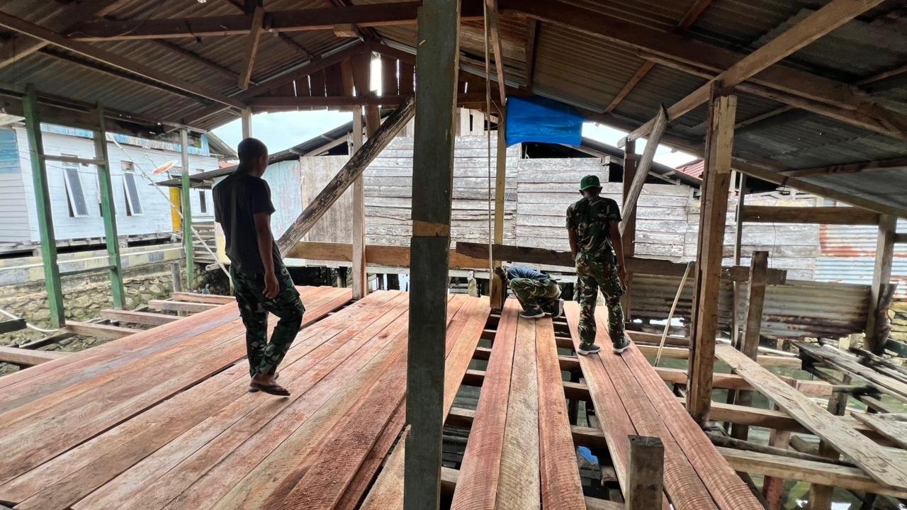 Dengan penuh ketelitian, prajurit memasang papan lantai secara presisi agar kokoh dan nyaman digunakan dalam jangka panjang. Proses ini dilakukan secara gotong royong bersama warga sekitar.