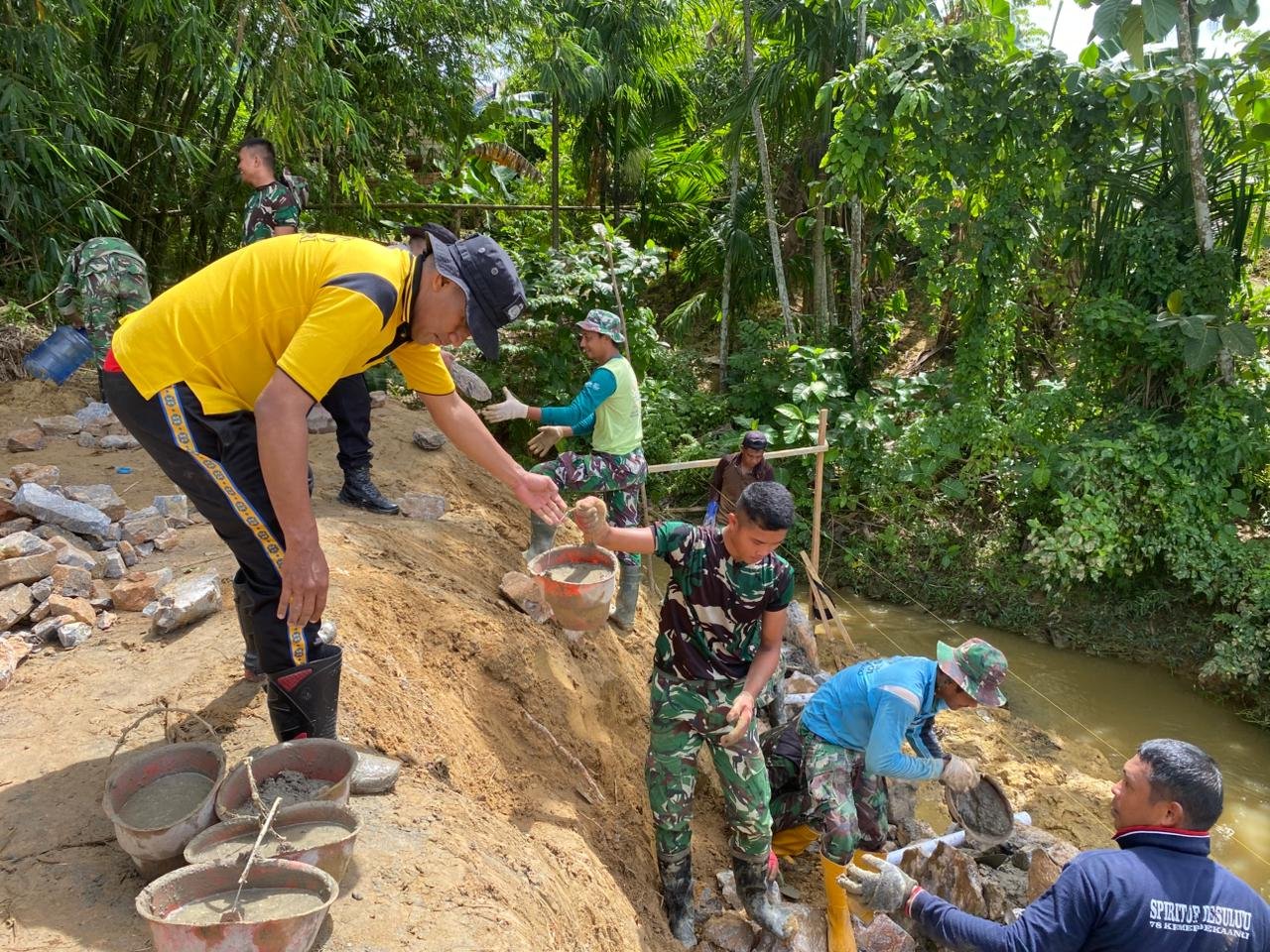 Personel TNI bersama aparat Kepolisian setempat tampak bekerja ekstra keras memindahkan material bangunan di medan yang cukup menantang. Kondisi lokasi yang berbukit tidak menyurutkan semangat mereka untuk menuntaskan pekerjaan sesuai target.