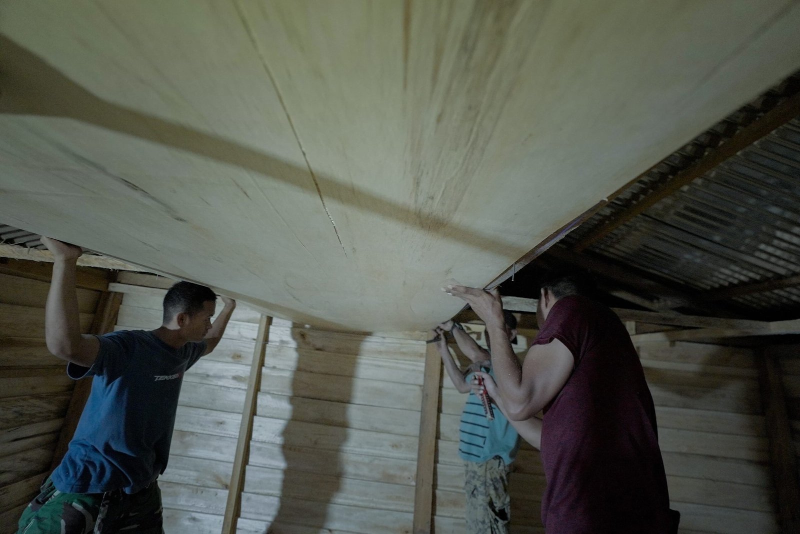 Meski hari telah gelap, para prajurit bersama warga setempat tetap melanjutkan pekerjaan pemasangan plafon rumah demi mengejar target penyelesaian pembangunan.