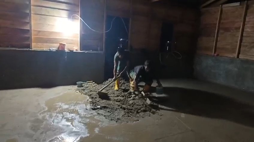 Personel Satgas TMMD bersama warga setempat bahu-membahu melakukan pengecoran lantai menggunakan campuran semen dan pasir agar menjadi lebih kokoh, bersih, dan higienis.
