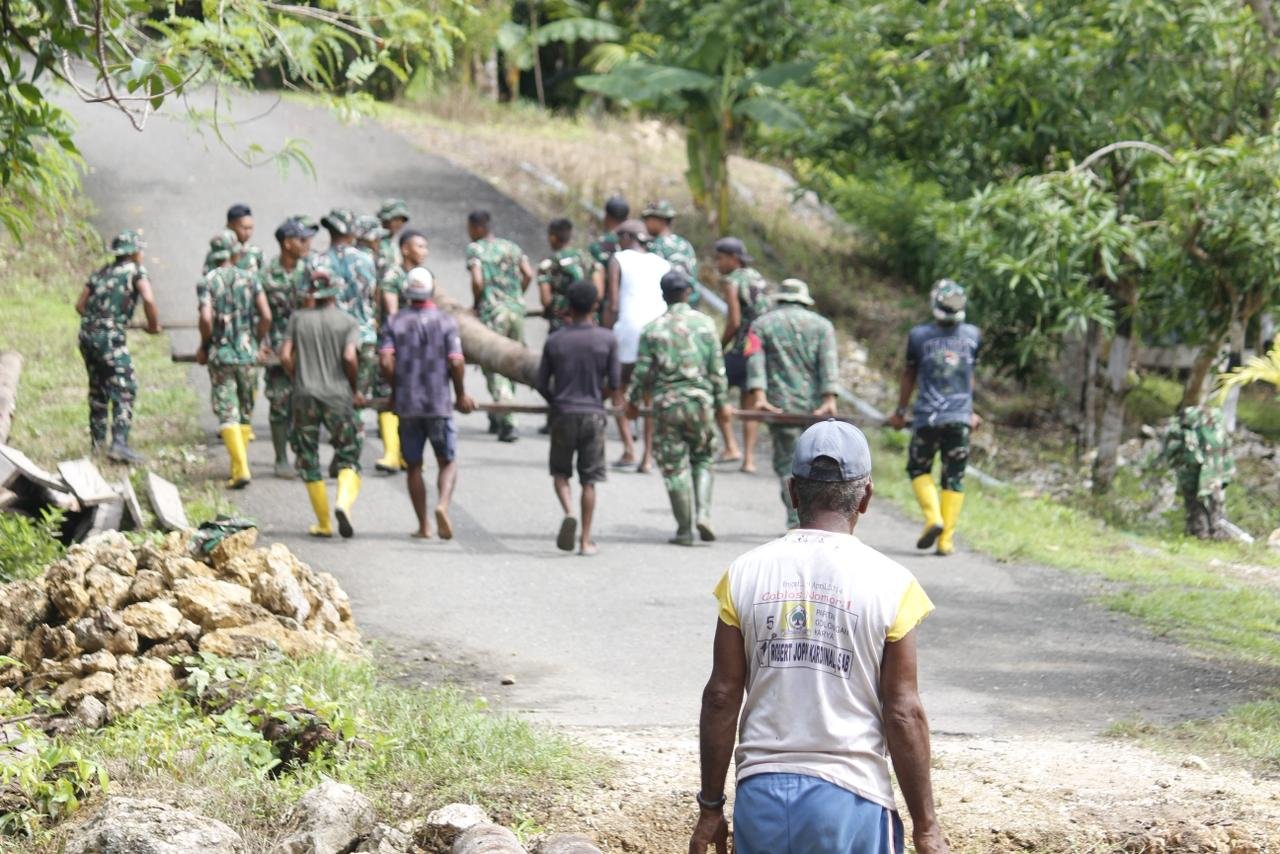 Dengan penuh kekompakan, anggota Satgas bersama warga bahu-membahu mengangkat dan memindahkan balok ke titik pemasangan. Suasana kebersamaan terlihat jelas, mencerminkan kuatnya kemanunggalan TNI dan rakyat di Kampung Marsi.
