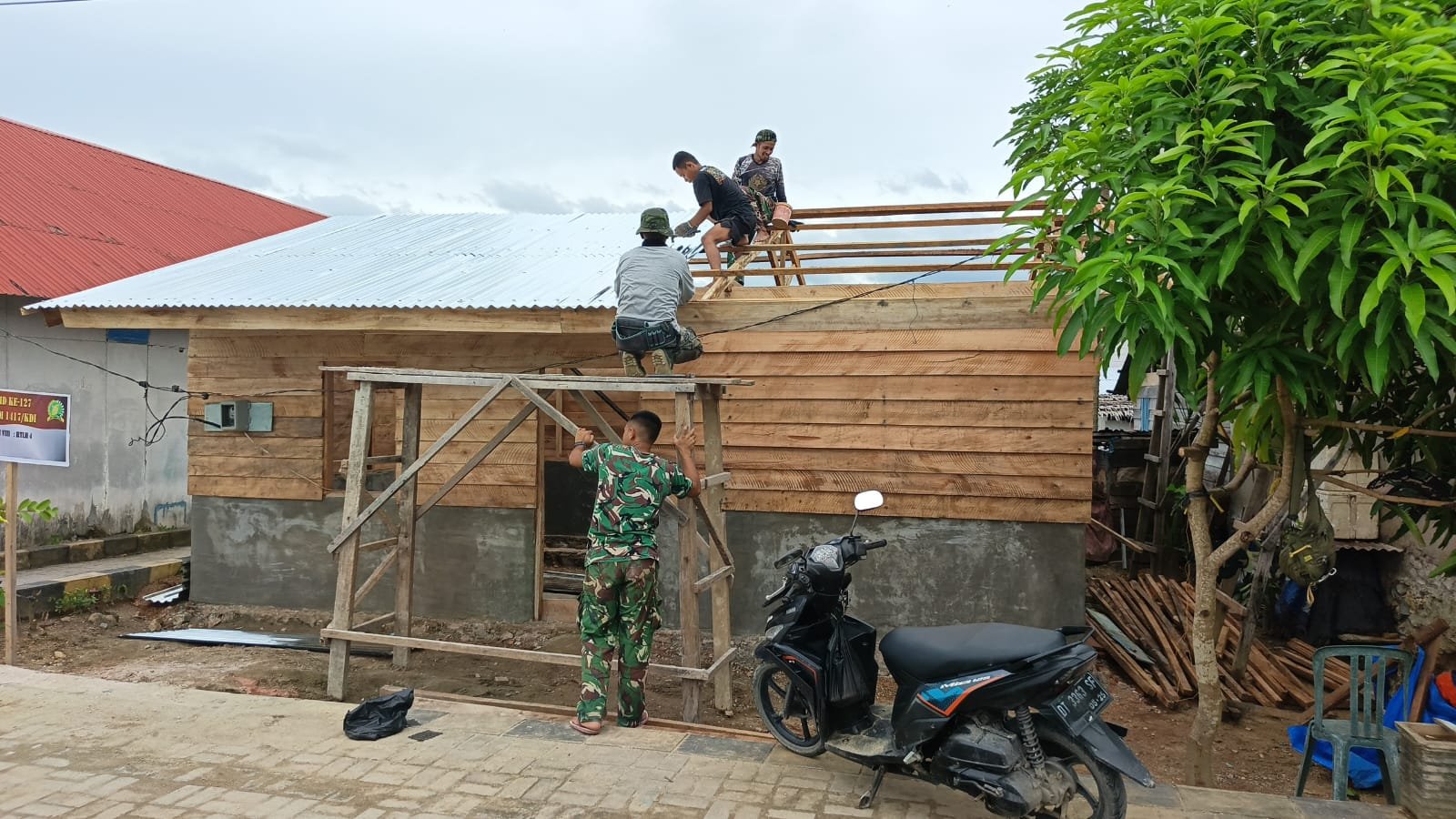 Personel TNI bersama warga tampak kompak menaikkan lembaran seng dan memasangnya ke rangka atap yang telah berdiri kokoh. Proses ini dilakukan dengan cermat untuk memastikan atap terpasang kuat dan rapi.
