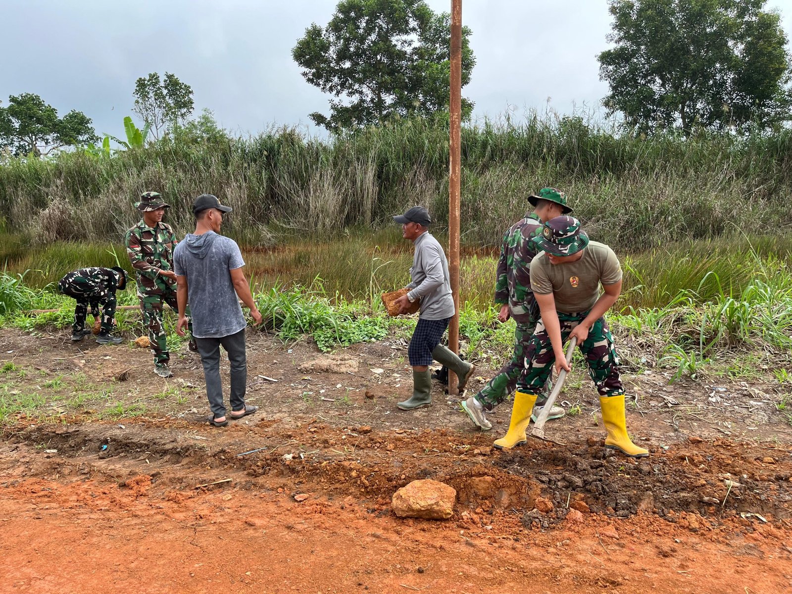 Pada tahap ini, personel Satgas bersama masyarakat melaksanakan kegiatan merapikan badan jalan yang sebelumnya masih belum rata dan belum padat secara maksimal. Perataan dilakukan agar struktur jalan lebih kokoh serta siap untuk tahapan pengerasan berikutnya.