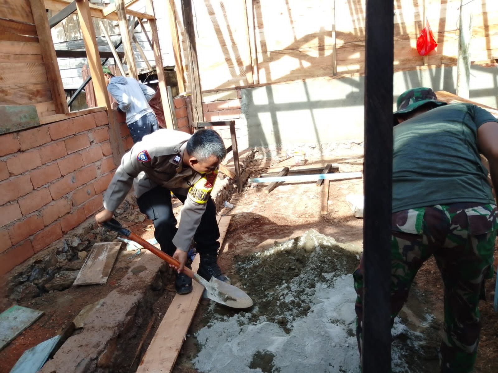 Tahapan plesteran menjadi fokus utama dalam program Rehabilitasi Rumah Tidak Layak Huni (RTLH). Dengan ketelitian tinggi, para prajurit meratakan adukan semen pada dinding bata guna memastikan permukaan lebih kuat dan tahan lama.