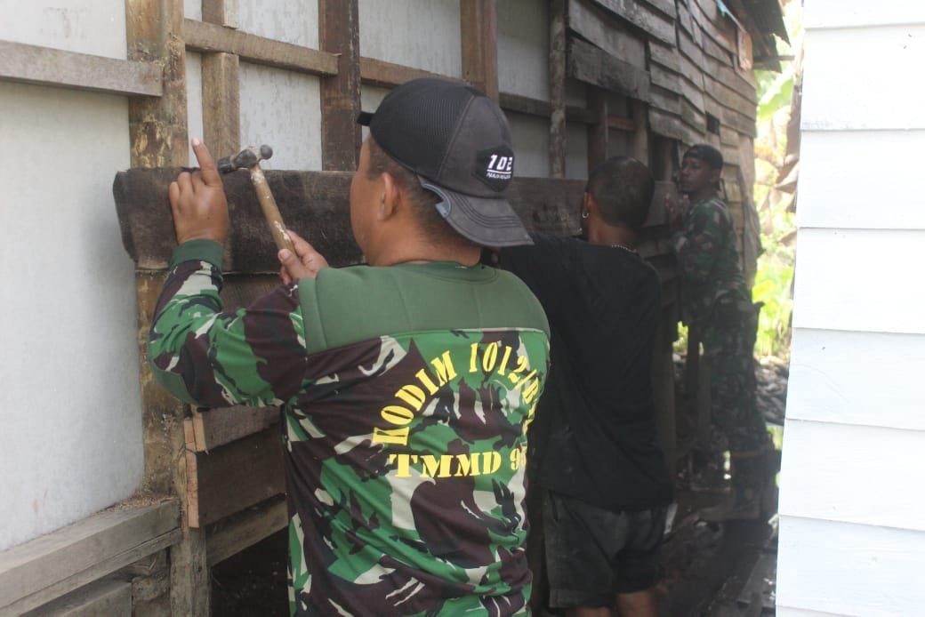 Satgas TMMD dan Warga Kompak Pasang Dinding RTLH di Desa Talio