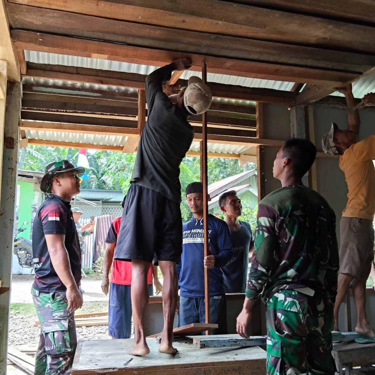 Sasaran 1 yang menjadi prioritas adalah pembangunan rumah milik Bapak Hengki, yang sebelumnya dalam kondisi tidak layak huni. Setelah penyelesaian rangka, tim langsung bergerak ke tahap pemasangan lantai menggunakan papan dari kayu besi sebagai material utama.