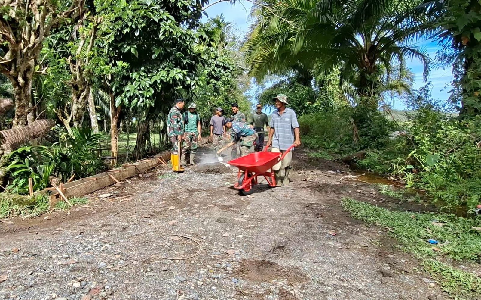 Di tengah suasana bulan suci Ramadhan, ibadah puasa tidak menyurutkan tekad dan semangat Tim Satgas TMMD bersama warga untuk menuntaskan pembangunan infrastruktur desa. Dengan penuh dedikasi, personel Satgas bahu-membahu melakukan pengecoran talud yang berfungsi menahan timbunan tanah serta mencegah potensi longsor dan erosi badan jalan.