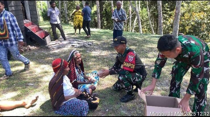 Meskipun keterbatasan alat, semangat gotong royong tetap tinggi. Anggota Satgas TMMD bersama warga setempat mengaduk campuran semen, pasir, dan air secara manual menggunakan cangkul dan sekop di atas permukaan rata sebelum diaplikasikan ke pondasi jembatan.