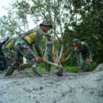 Sejak pagi, anggota Satgas TMMD dan warga bahu-membahu mengangkat pipa menuju sumber air (sumur). Pipa-pipa ini nantinya akan digunakan untuk mengalirkan air ke lahan pertanian yang selama ini mengalami kekeringan dan kesulitan irigasi.
