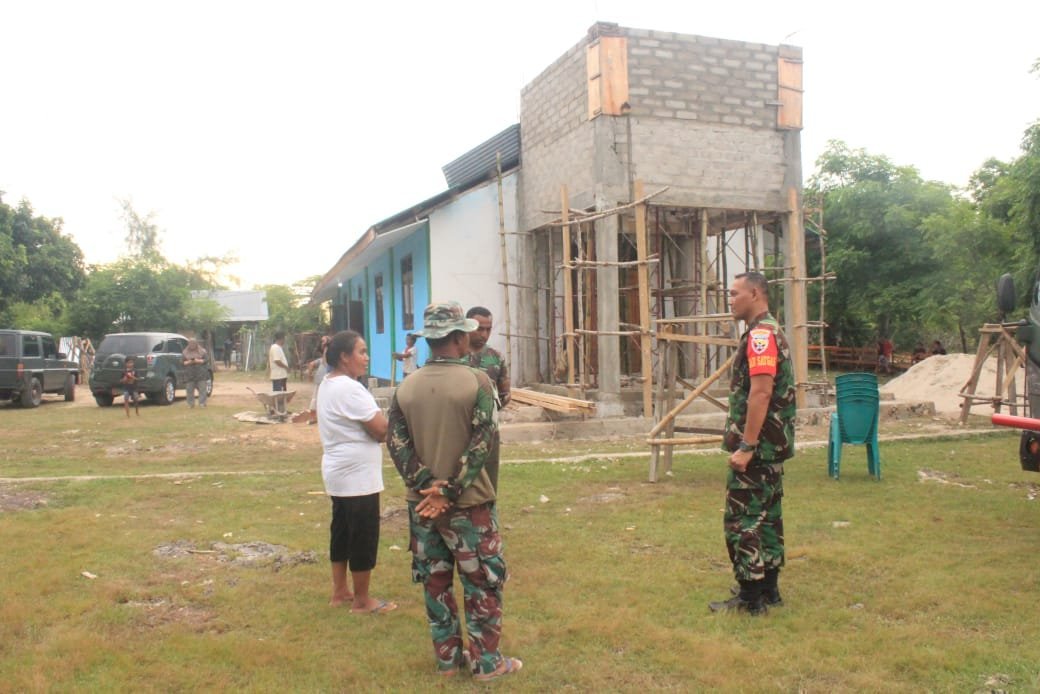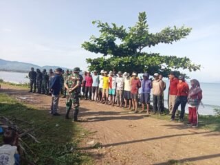 Terlihat para personel TNI bersama masyarakat setempat bekerja bersama di lapangan, menunjukkan semangat gotong royong yang menjadi ciri khas pelaksanaan TMMD.