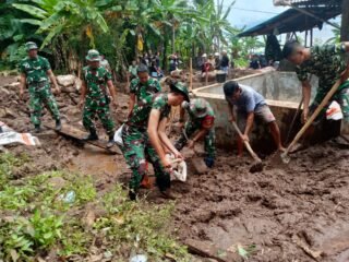 Warga sekitar tampak antusias membantu proses pekerjaan. Mereka membawa material, memotong kayu, hingga membantu meratakan papan lantai bersama anggota TNI. Rasa gotong royong dan semangat kebersamaan terlihat jelas di lokasi kegiatan.