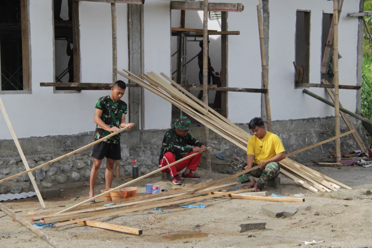 Dalam pelaksanaannya, personel Satgas TMMD bersama masyarakat setempat bekerja secara gotong royong mengerjakan berbagai tahapan pembangunan, mulai dari pemasangan material bangunan hingga penataan bagian konstruksi.