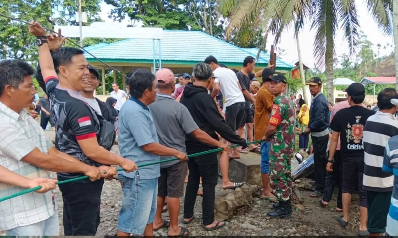 Anggota Satgas, bersama warga setempat, saling bahu membahu memindahkan cerucuk dari tempat penyimpanan ke titik-titik pemasangan. Kegiatan ini menjadi bagian penting dari tahapan pembangunan jalan penghubung antara Desa Danau Ganting dan Desa Talio yang sedang dilaksanakan melalui program TMMD Reguler Ke-124.