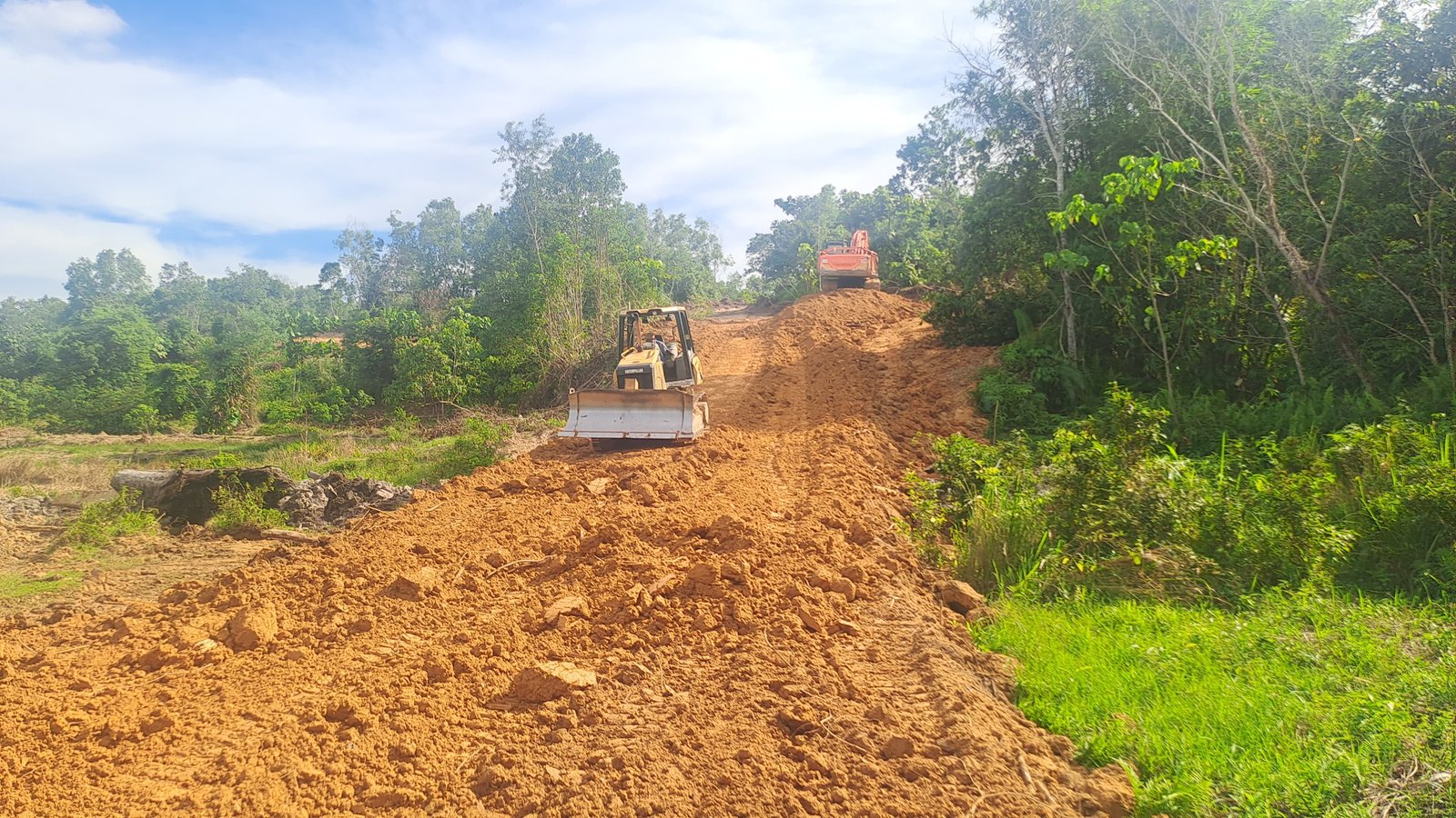 Dalam pemantauan langsung di lokasi, terlihat jelas sinergi antara alat berat modern, yaitu eksavator dan bulldozer, yang menjadi tulang punggung dalam percepatan pengerjaan badan jalan ini. Kedua alat berat tersebut bekerja secara simultan, eksavator bertugas melakukan penggalian dan penataan awal kontur tanah, sementara bulldozer berperan meratakan dan memadatkan material untuk membentuk struktur dasar badan jalan yang kokoh. Kolaborasi antara kedua alat berat ini memastikan proses penyiapan lahan berjalan efisien dan sesuai dengan target yang ditetapkan.